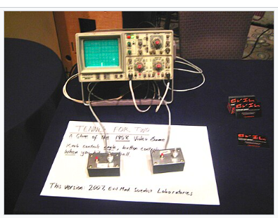 Puis vient le tour de Tennis for Two, un jeu vidéo de tennis conçu en 1958 par William Higinbotham et développé par Robert Dvorak, souvent considéré comme le premier jeu vidéo de l’histoire. Le jeu est développé sur un ordinateur analogique dédié et relié à un oscilloscope qui sert d’écran conçu à l’université dans le but de divertir les visiteurs du laboratoire de recherches.